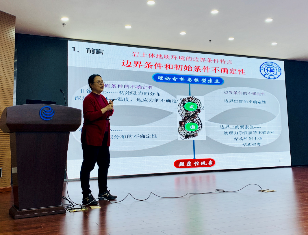 在报告中,王清教授首先介绍了川藏铁路穿越区环境背景呈高地震烈度、高陡坡、高寒和高地应力的特点,并结合吉林某地区边坡遇水失稳破坏的工程案例,指出岩土体多场耦合的地质环境特点,以及边界条件和初始条件不确定性的原因,致使理论分析研究与实际工程响应相差甚远。随后,她以红土、下蜀土和分散性土为典型介绍对象,指出所有类型的土都存在结构性,但由于地质环境的影响,其结构性的成因又不尽相同。最后,她还强调土体形成的地质条件是影响其工程特性的重要因素,现场勘察是岩土工程必不可少的环节。王清教授报告的内容涉及多学科领域,极大地丰富了现场师生关于工程地质重要性的理解。报告结束后,在场师生与王清教授就相关科学问题进行了热烈讨论,取得了非常好的学术交流效果。