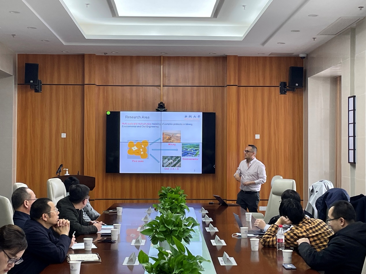 Sergio Torres副教授首先简单的介绍了土木工程、采矿工程以及环境工程等领域中复杂问题的多尺度分析理念,进一步讲解了微观层面(土壤颗粒、水滴、空气和气泡之间的相互作用)与现场尺度行为变化的物理联系。重点阐述了离散元建模及玻尔兹曼法在采矿工程气体冲击波评估,各向异性多孔介质材料渗透性,岩体裂隙网络连通性,砂柱散落等问题的仿真应用,并就其团队开发的两相-两点-物质点法在大变形仿真领域的应用和进展进行介绍。报告过程中,Sergio Torres副教授同与会科研人员进行了卓有成效的互动与讨论,并针对大家的现场提问进行细致认真地解答。本次报告会在浓厚的学术交流氛围中圆满结束。