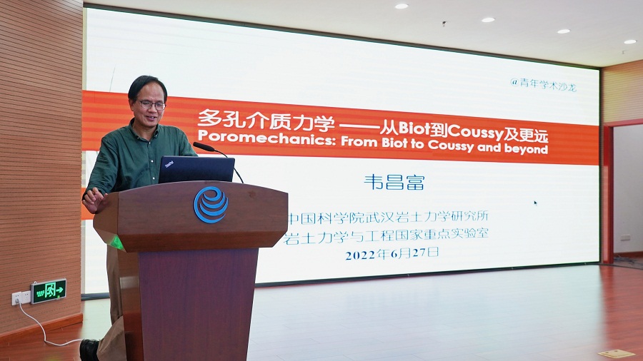 韦昌富研究员报告题目为《多孔介质力学——从Biot到Coussy及更远》,报告围绕沙龙主题,从多孔介质理论和混合物连续统理论两个角度,阐述了多相孔隙介质力学的基本框架及发展前景。