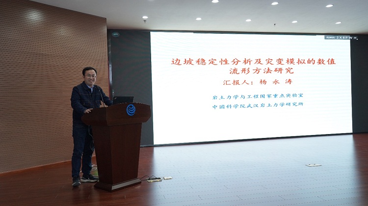 杨永涛副研究员的报告与前三位学者介绍的“创新的试验分析手段”主题不同,着力于数值理论分析,系统地介绍了数值流形法的起源与先进性,并列举数值流形法在无压渗流模拟以及高度离散的块体问题中的应用。