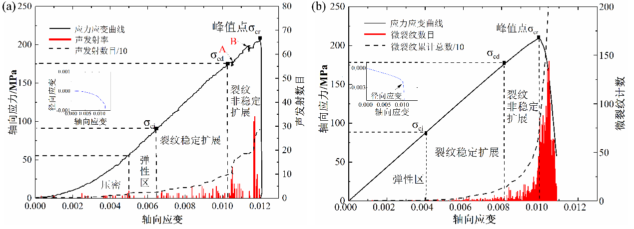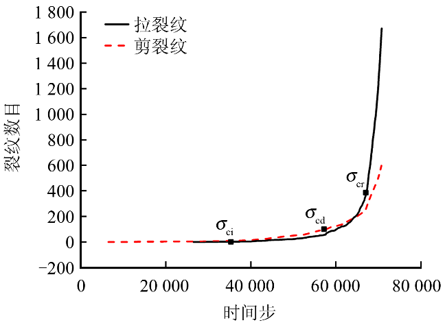 图2 岩石单轴压缩破坏过程微裂纹分布及微裂纹增长曲线