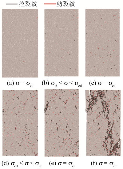 基于以上科学问题,中国科学院武汉岩土力学研究所基于室内试验和数值模拟,研究了川南龙马溪组页岩不同应力条件下的脆性破坏特征。岩土力学与工程国家重点实验室首先对龙马溪组页岩进行单轴压缩试验,获取岩石基本力学参数及声发射活动特征(图1a)。随后基于离散单元法建立数值模型,通过研究不同破坏阶段声发射与岩石细观破裂的对应关系,验证所建模型的合理性(图1b)。最后,利用该模型模拟不同围压下的三轴压缩试验,研究龙马溪组页岩在不同应力条件下的脆性破坏形式和特征应力的变化规律。