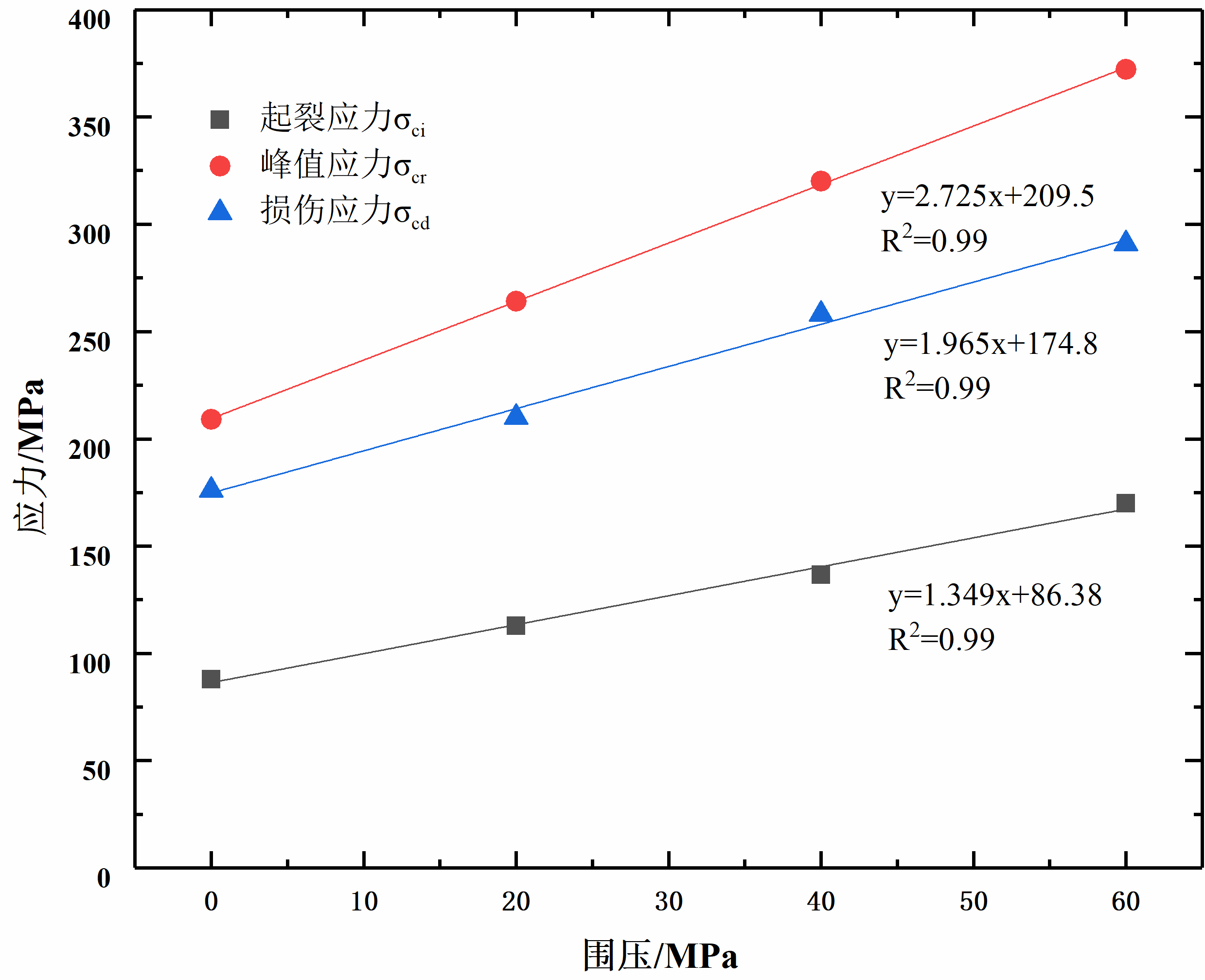 研究结果表明,该龙马溪组页岩脆性矿物含量高,强度大,脆性特征明显。在不同应力条件下该龙马溪组页岩发生脆性破坏时具有相似的破坏特征,且峰值强度符合Mohr-Coulomb线性规律。当加载到岩石损伤应力以前,微裂纹的分布无明显方向性和区域性,该时微裂纹的分布应与岩石的非均质性有关;损伤应力后微裂纹的萌生、聚集和贯通将受应力影响(图2)。页岩的特征应力(起裂应力、损伤应力、峰值强度)与围压表现出强相关性,但围压对峰值应力的影响程度比对损伤应力和起裂应力的影响程度更大(图3)。该结果是由于在裂纹稳定扩展阶段,微裂纹独立产生无相互影响,而峰值应力还需考虑微裂纹间的相互作用及形成的宏观破裂面粗糙性的影响。该基础性研究结果可为页岩气开发过程中动态监测及开发方案制定提供一定参考依据。