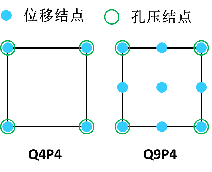 多孔介质渗流-应力耦合模型(Biot模型)在岩土工程领域有着重要应用。岩土结构的响应是固体骨架与孔隙流体之间相互作用的结果。为了预测结构行为,常常采用有限元法对Biot方程进行数值求解。然而,当流体或固体不可压缩或接近不可压缩以及多孔介质渗透系数非常小时,方程变得病态,引起数值解的不稳定,出现孔隙流体压力紊乱的现象。要解决这个问题,所采用的单元需要满足Babuska-Brezzi条件或其等价的Zienkiewicz分片插值试验条件。遗憾的是,我们经常采用的等阶插值形式的常规有限单元(如双线性四边形Q4P4单元,图1)并不满足上述条件,无法保证计算的稳定性。为此,通常是换用位移插值函数比孔压插值函数高一阶的二次单元(即Taylor-Hood单元,如Q9P4,图1)来保证“安全”。虽然通过增加中间节点的办法增强了单元弯曲性能,同时也保证了耦合求解的稳定性,但这样带来的前处理和计算的开销却几乎成倍增加。因此,为了保证计算效率,基于低阶单元(如Q4P4单元)的多孔介质流固耦合有限元稳定化求解技术一直被研究者们所关注。