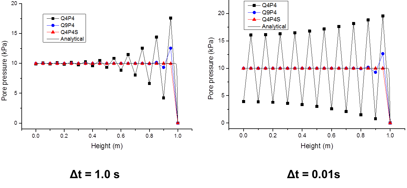 中国科学院武汉岩土力学研究所土动力学组李文涛助理研究员,长期致力于多相孔隙介质多场耦合高效数值方法的研究。基于局部投影稳定化算法,提出了多孔介质流固耦合稳定化有限元方法。该方法规避了常规混合有限元需要满足的Babuska-Brezzi条件,对等阶插值的线性单元有很好的适用性。利用合理的稳定化系数,在该方法中成功地嵌入了离散极值原理(DMP)。通过对经典的Biot固结算例的模拟分析,并与常规的Q4P4单元和Q9P4单元的计算结果进行对比,测试了稳定化的Q4P4S单元在多种情况下的性能表现。结果表明,与Q4P4单元表现出的全局震荡和Q9P4单元表现出的局部震荡不同,这里提出的稳定化单元Q4P4S具有良好的稳定性和单调性,在结构和非结构网格情况下都工作良好,计算结果与解析解得出的结果完全吻合。算例结果充分说明了该有限元稳定化求解技术能够完全消除数值求解过程中的孔隙压力震荡现象,大幅地提高了有限元方法求解Biot方程的计算精度和稳定性。