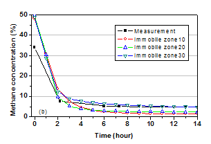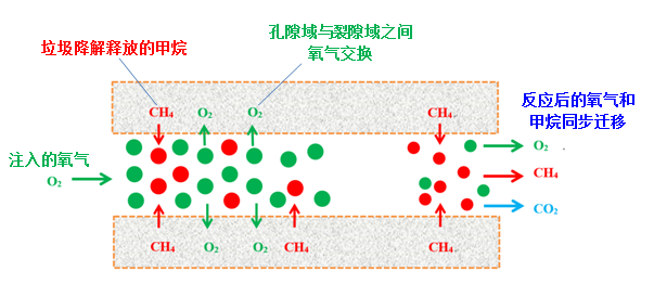 中国科学院武汉岩土力学研究所环境土力学与工程学科方向组团队长期致力于垃圾填埋场多组分气体迁移理论和仿真计算方面的研究,针对垃圾土多孔介质的典型特征,提出了垃圾土孔隙介质优势流路径和非流动区域气体流动及化学反应的概念模型,构建了考虑优势流效应下多组分气体迁移的渗流-化学耦合数学模型,模拟了氧气注入过程中氧气和甲烷协同反应及分布状态,发现了非流动区域甲烷产出对氧气分布的影响规律,为填埋场注气系统的设计和运行提供了理论依据。