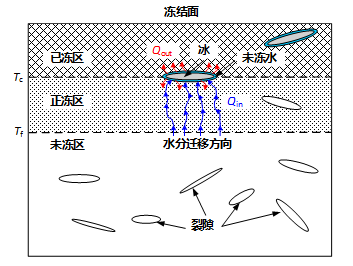 裂隙岩体的冻胀破坏是寒区岩土工程建设中不可回避的难点问题。主要原因是低温及冻融循环条件下水→冰相变与水分迁移产生的冻胀力引起岩体内微裂隙与贯通,从而导致灾难性破坏。因此,揭示裂隙岩体内冻胀力演化规律对维护寒区岩体工程稳定和安全具有重要意义。针对现有研究成果主要集中在水→冰相变理论和未冻水含量对冻胀力影响,而其他影响冻胀力的因素(如岩石和冰的强度参数)关注较少的现状,本成果以含单裂隙岩体为研究对象,在若干假设条件下,通过理论推导,提出了含单裂隙岩体冻结过程冻胀力计算模型,得到的主要结论如下: