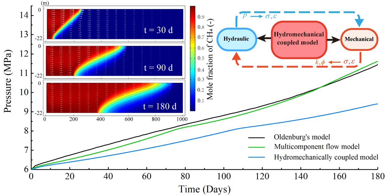 二氧化碳作为垫层气注入目标储层,以提供储层所需压力并防止地下水入侵,从而减少回采期甲烷的能量损失。为降低两种气体混合度并保证储层力学稳定性,首先研究了二氧化碳和甲烷气体的各自物理性质和其混合气体的物理性质,基于二氧化碳在临界点的物性变化特点以及混合气体的物性变化特点,建立了水力耦合模型来研究流体在储层中的运移机制,气体间的混合机制,以及储层力学稳定性。其次,通过与已发表模型进行比对,发现计算结果获得良好的一致性,从而进一步确认了建立的流动模型的可靠性。随后建立的逐级复杂的水力耦合模型,针对不同的储层厚度、地质构造、温度以及注入过程中储层力学稳定性进行了详细的研究,结果发现储层厚度的提升,背斜角度的提升以及温度的提升对气体混合度的降低都有一定程度的积极意义。最后,通过力学稳定性分析,确定了储层安全注入的压力条件,为实际场地建设提供了借鉴意义。