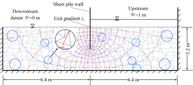 本研究将传统有限元法与径向基点插值法(RPIM)相结合,形成一种FE-RPIM方法,它比传统的FEM有着更大的支持域,而且插值函数的形成不依赖于局部坐标,可以明显地减小传统FEM的“网格依赖性”,即使在网格发生畸变,甚至相互嵌入时,仍能获得较为精确的结果。此外,在求解渗流自由面时,提出了“自适应节点调整法”的逸出点定位方案,它结合了“修正网格法”和“固定网格法”的优点,在保持网格不变的前提下,可以获得很高的精度。