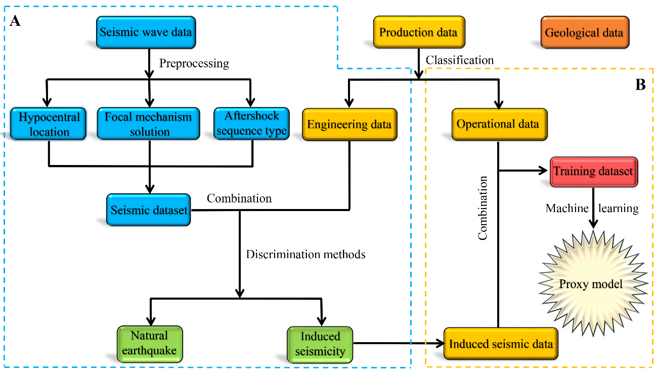 在新框架中,以阈值震级作为诱发地震风险控制的决策变量,针对某一有限的研究区域,收集带有地质、地震和生产信息的多种数据并结合传统地震学方法进行预处理,选择恰当的机器学习方法训练出能反映操作参数与阈值震级之间复杂映射关系的代理模型。与现有的基于解析和统计方法确定的阈值震级相比,基于大量数据训练得到的代理模型可望具有更强的适用性和鲁棒性,能够通过现场的操作参数更为有效地确定不同警戒级别之间的阈值震级。