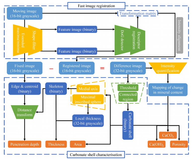 论文题目:Characterisation of wellbore cement microstructure alteration under geologic carbon storage using X-ray computed micro-tomography: A framework for fast CT image registration and carbonate shell morphology quantification
