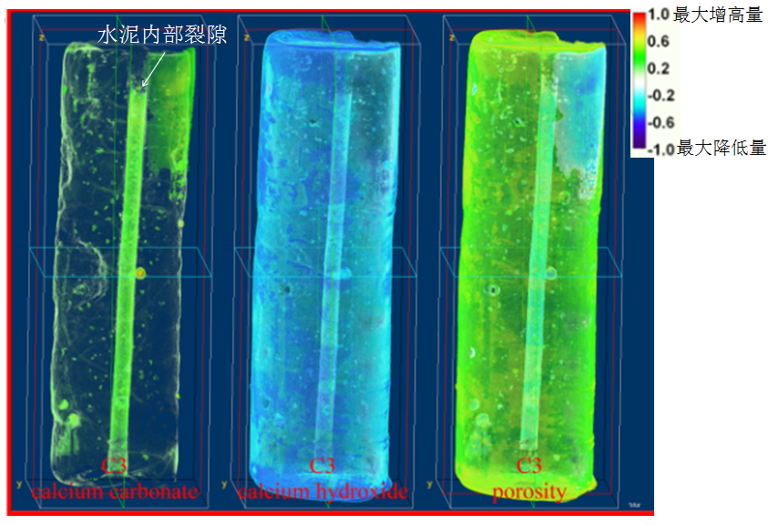 图3 固井水泥与高浓度CO2反应后碳酸钙、氢氧化钙和孔隙度变化的三维视图