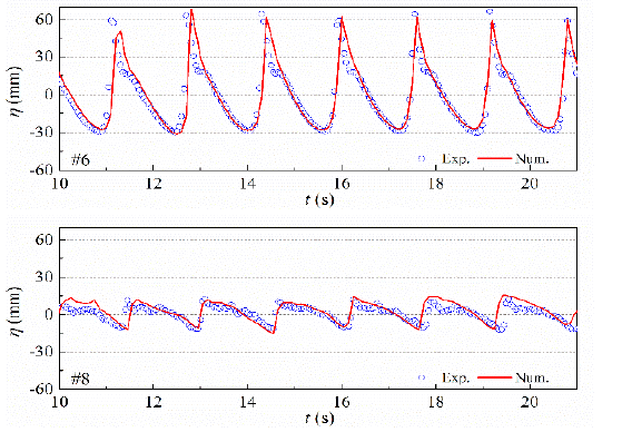 图2 数值模拟与试验测试结果验证(α=2°,d2=0.3m,h=4.8m,H=2.4m,T=8.67s)