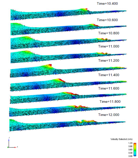 图3 沿数值模拟波浪传播过程,α=4°, h=4.80m, d2=0.30m,H=2.40m,T=8.67s