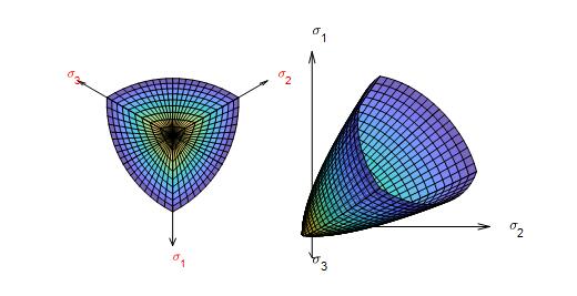 与线性莫尔-库仑破坏准则相比,该模型在子午面上是非线性抛物线,使得该准则更适用于岩石力学。此外,在数值分析中,该准则比Mohr-Coulomb准则和Hoek-Brown准则更容易收敛:它在屈服面上有3条非光滑棱线,而Mohr-Coulomb准则和Hoek-Brown准则有6条非光滑的棱线。