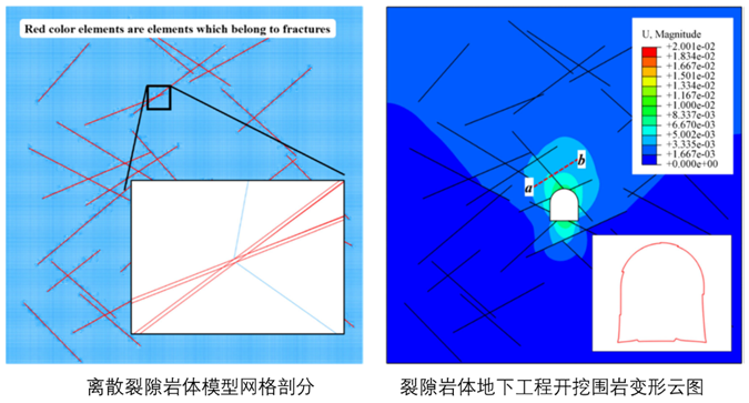 针对这一问题,在陈卫忠研究员带领下,武汉岩土所施工过程力学学科组对裂隙岩体建模和数值仿真方法展开了系统研究,重点解决随机裂隙生成和复杂裂隙网络的网格剖分两个关键问题。发展了一种随机多裂隙生成算法,该模型可考虑每条裂隙的真实隙宽,在数值仿真中对裂隙设置不同的力学参数,可反映不同地质情况下的裂隙特性。为解决模型网格剖分问题,发展了一种适用于复杂裂隙岩体模型的单元自适应生成方法,能够处理交叉裂隙处的网格单元生成问题。随后,将离散裂隙模型(DFM)和粘结单元模型(CZM)结合,发展了一种离散裂隙-粘结单元方法(DFM-CZM),通过损伤因子演化反映裂隙面破坏现象,由此能模拟多个随机裂隙面的损伤渐进破坏,使其兼具DFM处理多裂隙和CZM模拟损伤渐进的优点。综合运用本研究所发展的方法,对地下工程的稳定性进行数值仿真研究。