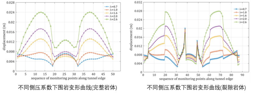 图2 不同侧压系数下完整岩体和裂隙岩体的围岩变形曲线