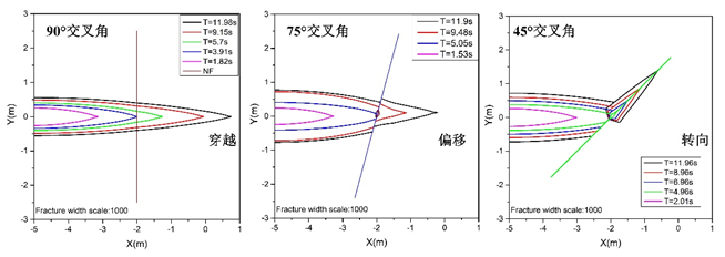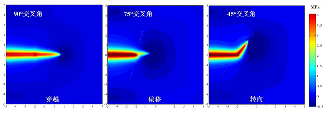 针对这一问题,中国科学院武汉岩土力学研究所杨典森研究员带领团队基于扩展有限元数值方法,提出了考虑压裂液滤失效应的渗流—应力耦合压裂模型,解决了扩展有限元交叉裂缝处理难题;针对水力裂缝与天然裂缝相互作用问题,提出了一种基于应力—能量的裂缝穿越判断准则,实现了水力裂缝穿透/转向/终止/偏移等各种不同相互作用行为的准确模拟。基于提出的渗流—应力耦合水力压裂模型和裂缝穿越判断准则,系统研究了天然裂缝的力学与渗透特性、施工参数及岩石基质参数对含裂缝储层压裂效果的影响,揭示了可渗透介质中水力裂缝与天然裂缝相互作用机理。