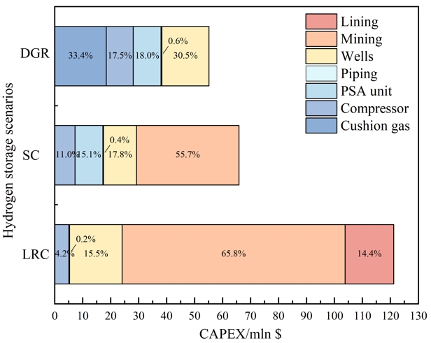 图2 存储107kg H2各储氢场景下资本支出成本(CAPEX)组成,其中DGR(depleted gas reservoir)为枯竭气藏;SC(salt cavern)为盐穴;LRC(Lined rock cavern)为衬砌硐室
