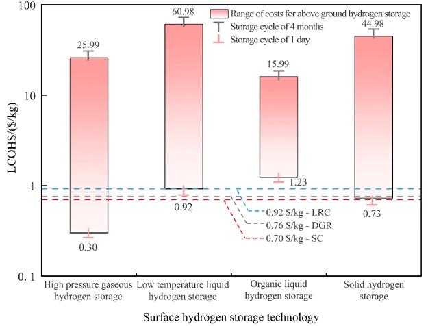 图4 地面储氢技术与地质储氢经济性对比,其中,High pressure gaseous hydrogen storage 为高压气态储氢技术;Low temperature liquid hydrogen storage 为低温液态储氢技术;Organic liquid hydrogen storage 为有机液态储氢技术;Solid hydrogen storage 为固态储氢技术