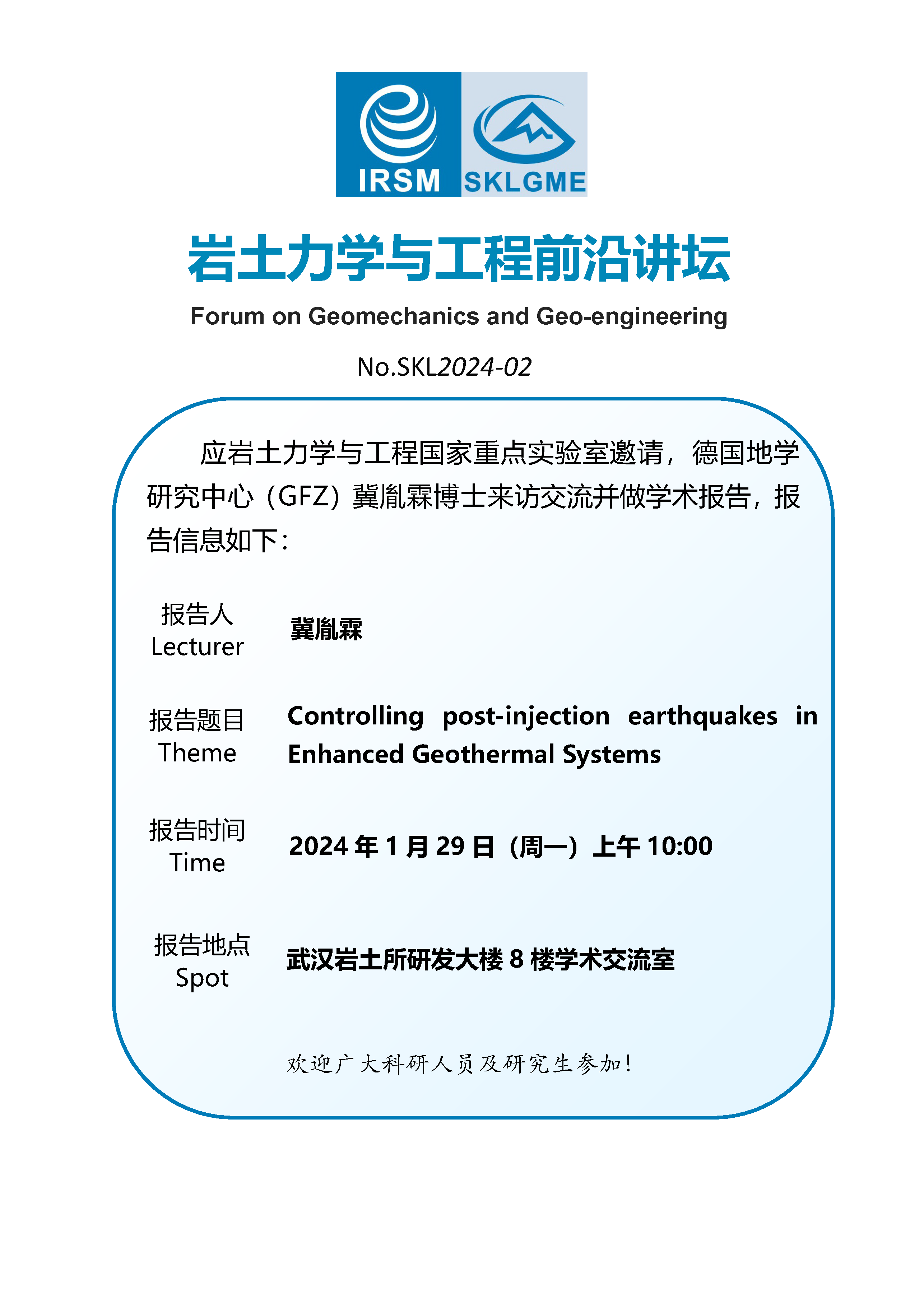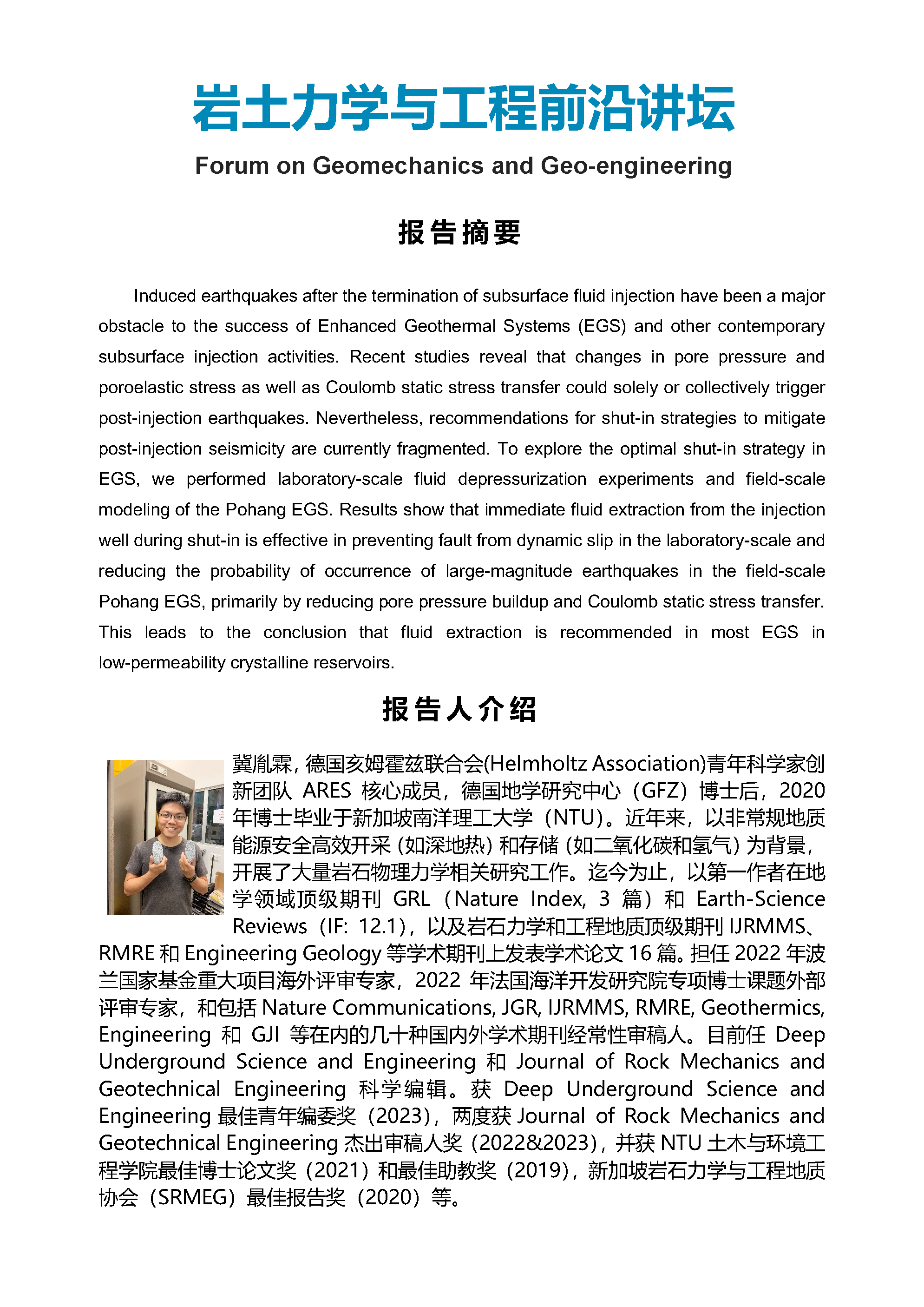 岩土力学与工程前沿讲坛——Controlling post-injection earthquakes in Enhanced Geothermal Systems