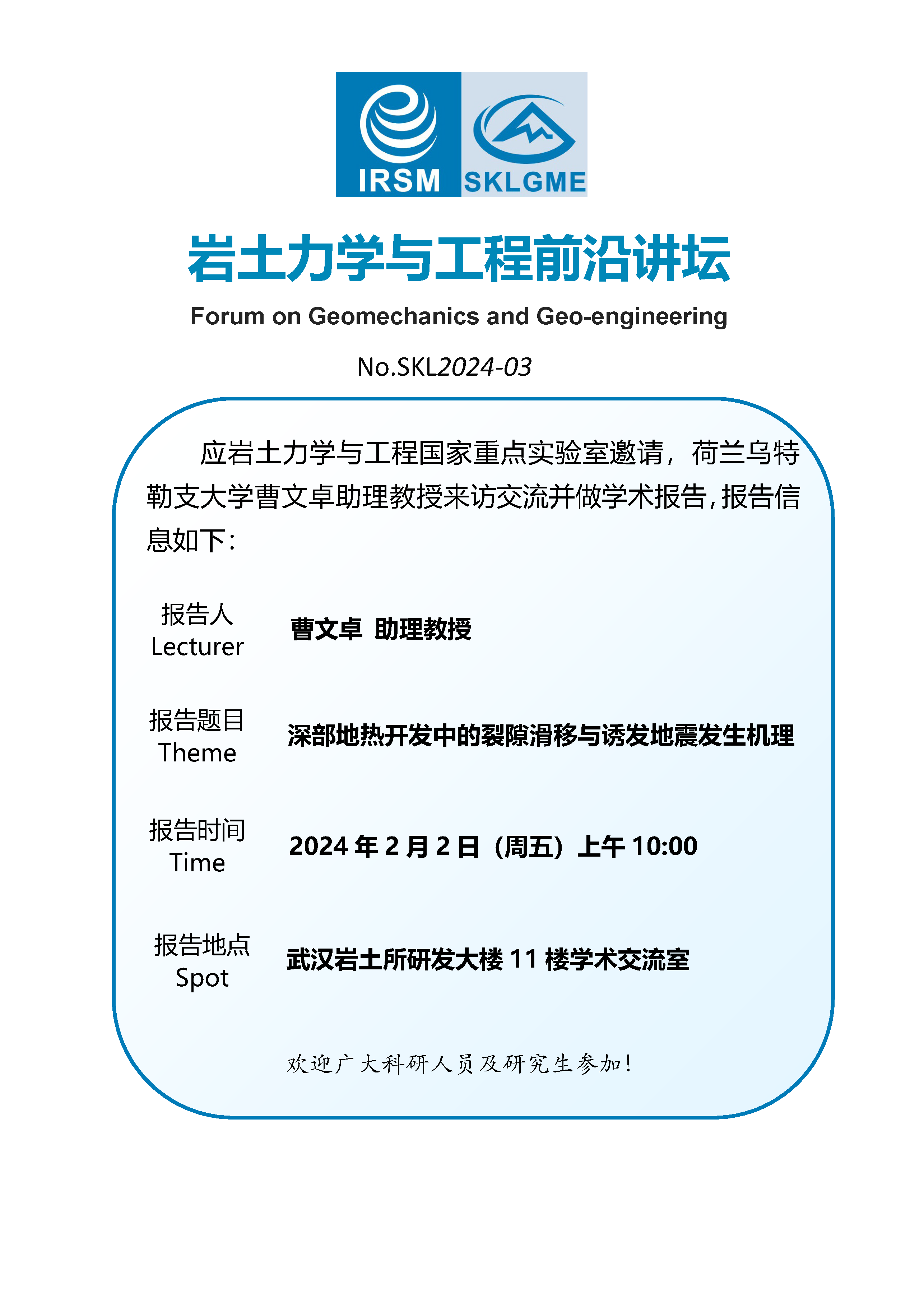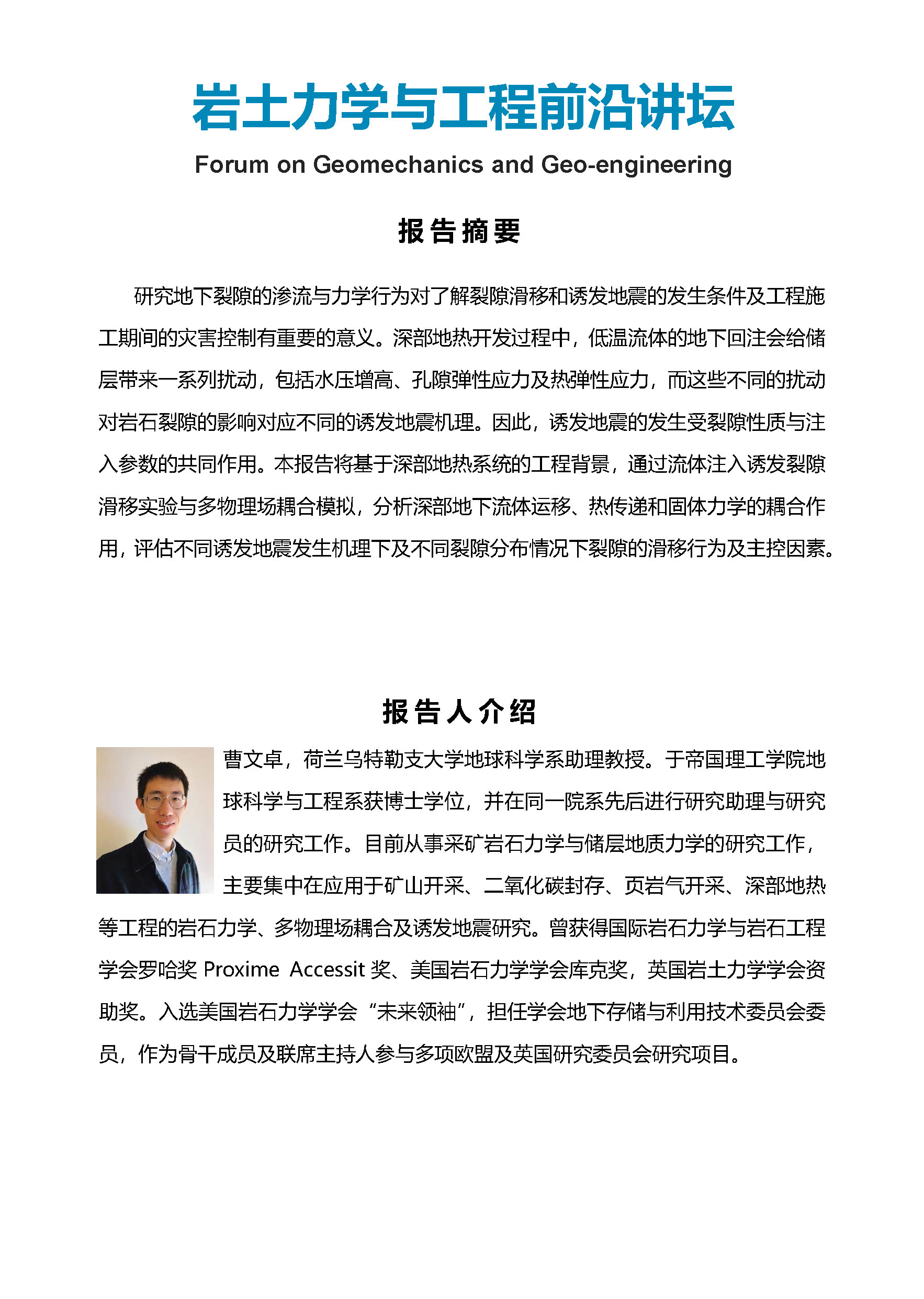 岩土力学与工程前沿讲坛——深部地热开发中的裂隙滑移与诱发地震发生机理